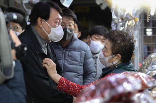 윤석열 국민의힘 대선 후보가 6일 오전 서울 송파구 가락농수산물종합도매시장을 방문, 건어물 상점 상인과 대화하고 있다. 2021.11.6 [이미지출처=연합뉴스] |