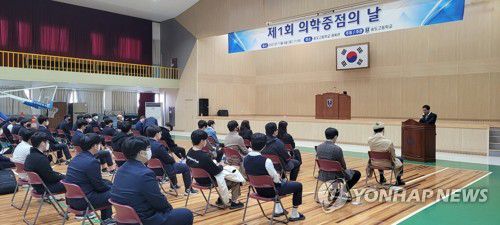 (인천=연합뉴스) 6일 인천 송도고에서 열린 '제1회 의학 중점의 날' 행사에서 이상원 교장이 인사말을 하고 있다. 과학 중점과정과는 별도로 의학 중점과정도 운영하는 송도고는 학교 동문이자 한국의 슈바이처로 불리는 장기려 박사의 박애 정신을 계승하기 위해 매년 '의학 중점의 날' 행사를 열기로 했다. 2021.11.06 [송도고 제공. 재판매 및 DB 금지]