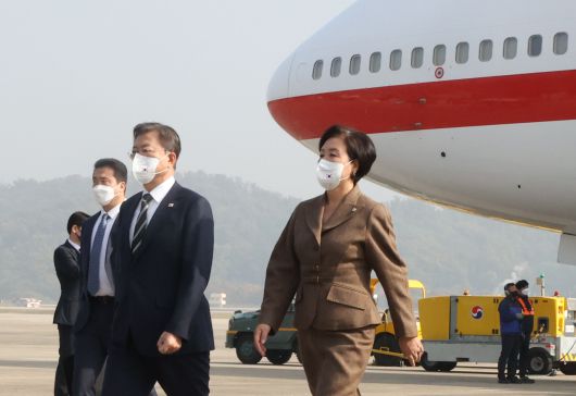 주요 20개국(G20) 정상회의와 제26차 유엔 기후변화협약 당사국총회(COP26) 참석 등 7박 9일간의 유럽 순방일정을 마친 문재인 대통령과 김정숙 여사가 5일 경기도 성남시 서울공항에 도착, 공군 1호기에서 내려 이동하고 있다. /연합뉴스 |