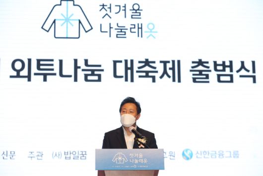 오세훈 서울시장이 4일 오전 서울시청에서 열린 제4회 첫겨울 나눌래옷 출범식에서 축사를 하고 있다. 이 행사는 옷장 속 잠자는 외투를 세탁해 외투가 필요한 외국인에게 택배로 배송한다. [사진 출처 = 연합뉴스] |