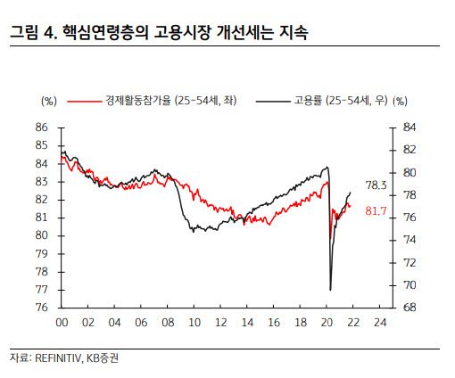 8일 김일혁 KB증권 연구원은 “코로나19 델타 변이 바이러스가 통제되면 서비스업이 회복되고, 고용 개선이 되면서 소비심리가 반등하는 선순환의 고리가 형성되기 시작했다”며 “화이자의 경구용 치료제가 예상보다 높은 효과를 내는 것으로 알려지면서 긴급 사용승인을 받으면 저임금 서비스업 고용 회복에 크게 기여할 것”이라고 말했다. 이어 “경제활동참가율과 고용률이 거의 개선되지 않았지만, 핵심연력층으로 좁혀 놓고 보면 상승, 장기 실업자수와 비일시적 해고자수도 감소하는 등 팬데믹 충격에서 벗어나고 있다”고 덧붙였다.