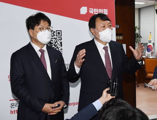 국민의힘 윤석열(오른쪽) 대선 후보가 8일 국회에서 열린 최고위원회의에 참석한 후 취재진에게 후보 비서실장으로 권성동 의원을 선임한다고 설명하고 있다. /국회사진기자단 |