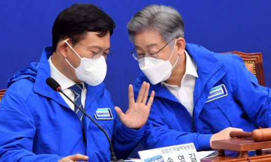 이재명 더불어민주당 대선 후보와 송영길 대표가 8일 국회에서 열린 중앙 선거위원 대책 회의에 앞서 얘기를 나누고 있다. 뉴스1 |