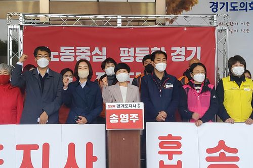 송 전 의원은 "기득권 정치세력인 양당은 대통령 선거를 4달가량 앞두고도 민생은 뒷전에 두고 그들만의 싸움에 골몰하고 있다"며 "경기도지사 후보로서 진보 진영의 후보 단일화를 이뤄 양당 기득권 체제를 반드시 심판하겠다"고 강조했다.