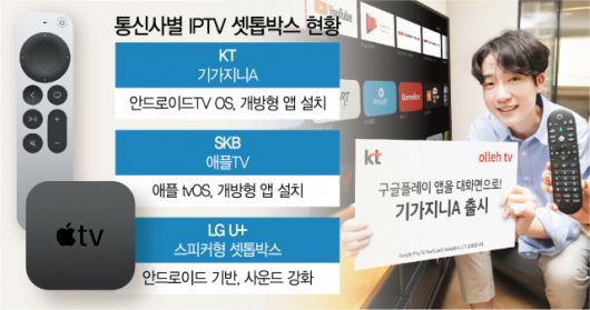 통신사가 제공하는 애플리케이션(앱)만 사용 가능하던 인터넷TV(IPTV) 셋톱박스가 개방형으로 진화하고 있다. 안드로이드나 iOS 등 운영체계(OS)에 관계없이 앱 장터에서 자유롭게 다운로드 받아 셋톱박스에 설치해 사용할 수 있는 상품들이 속속 등장하고 있다. 고객 입장에서는 자신이 사용하는 IPTV 업체가 어떤 온라인동영상서비스(OTT)와 독점 제공협약을 맺었느냐와 관계 없이 다양한 서비스를 이용할 수 있다. IPTV 업계는 디즈니+ 등 특정 OTT와 독점 계약에 실패했다고 해도 셋톱박스를 개방형으로 전환하면 해당 콘텐츠를 제공할 수 있어 고객을 잃지 않을 수 있다.