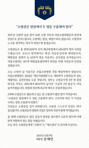 문 대통령은 제59주년 소방의날인 이날 SNS를 통해 "16만 소방 가족과 의용소방대원들의 헌신에 진심으로 감사드린다"면서 이같이 밝혔다.