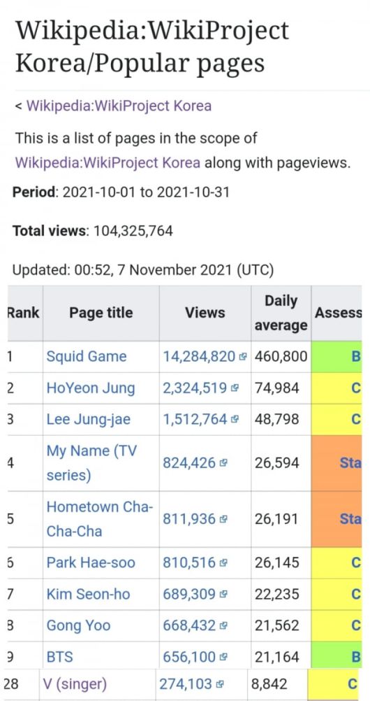 방탄소년단 뷔가 위키피디아(Wikipedia) 10월 공식랭킹에서 한국 남자 가수 페이지뷰 1위에 올랐다.