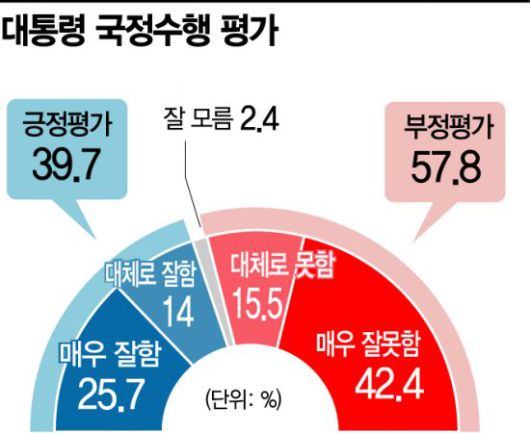 이외 30대(57.6%), 50대(56.2%), 60대(62.5%)에서도 '잘못하고 있다'는 부정응답이 우세했다. 40대에서만 긍정응답이 57.2%로 부정응답(41.8%)보다 많았다.