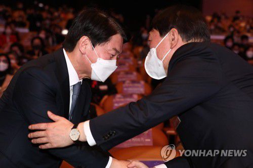 (서울=연합뉴스) 이유미 이은정 기자 = 국민의힘 윤석열 대선 후보와 국민의당 안철수 대선 후보가 9일 여성 행사에서 조우했다.