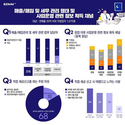 비즈넵은 리서치 전문 기업 엠브레인과 함께 연매출 30억 원 이하의 자영업자 1075명을 대상으로 ‘매출, 매입 및 세무 관리 행태’ 및 ‘사업운영 관련 정보 획득 채널’에 관련된 설문 조사를 진행했다.