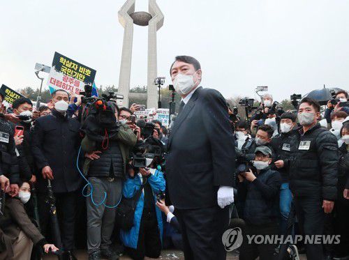 (광주=연합뉴스) 정회성 기자 = 국민의힘 윤석열 대선후보가 10일 항의·지지 목소리가 뒤엉킨 국립5·18민주묘지에서 '미완의 참배' 끝에 발길을 돌렸다.