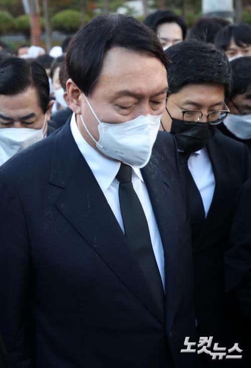 윤석열 국민의힘 대선 후보가 10일 광주 5·18 민주묘지를 찾아 추모탑에 헌화.분향하려다 시민들의 반대에 가로막혀 추모탑 입구에서 묵념으로 참배를 대신하고 있다.저작권자 © CBS 노컷뉴스 무단전재 및 재배포 금지