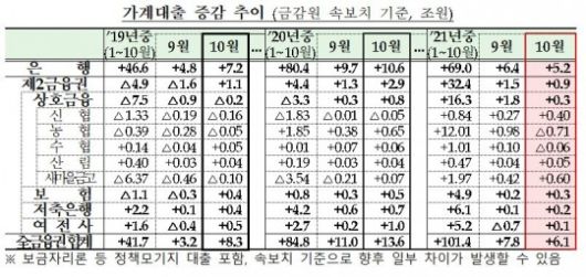 신용대출을 포함한 기타대출은 전월보다 5000억원 늘었다. 9월(8000억원)보다 증가폭이 줄었다. 금융당국에 따르면 신용대출 증가액은 지난달 출범한 토스뱅크(5000억원)가 대부분을 차지했다. 신용대출 한도를 줄인 5대 시중은행(KB국민·신한·하나·우리·NH농협)의 신용대출은2000억원 줄었다.