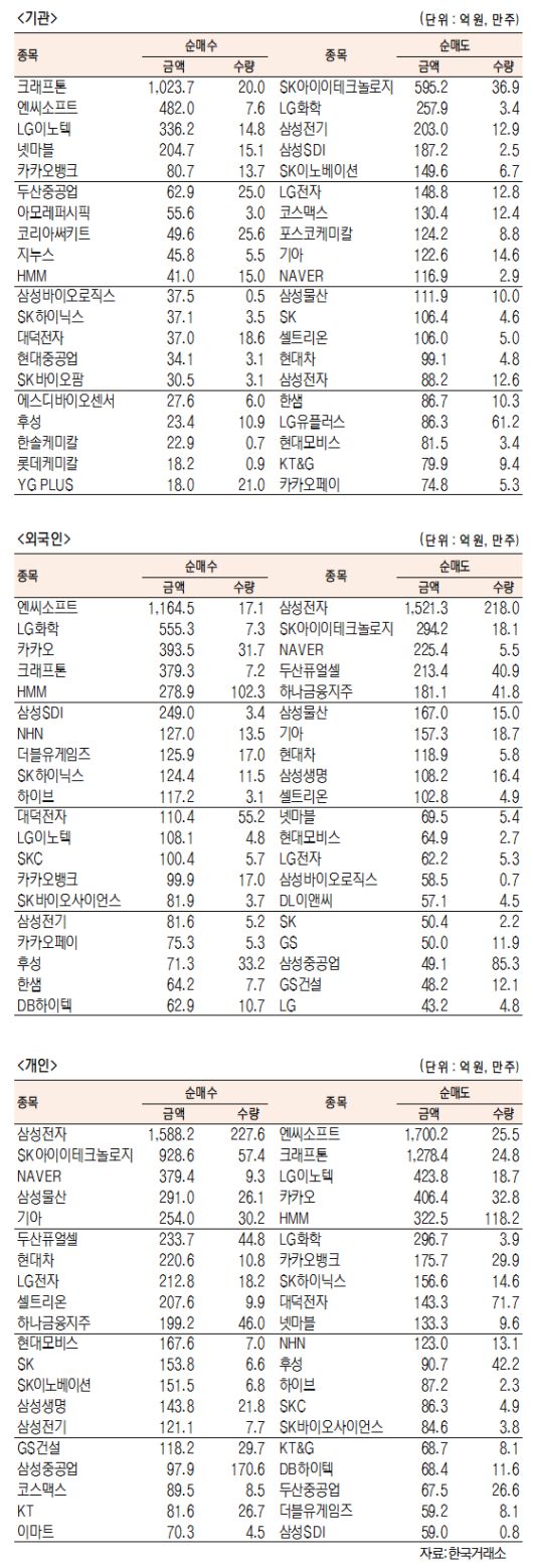 [표]유가증권 기관·외국인·개인 순매수·도 상위종목( 11월 11일)