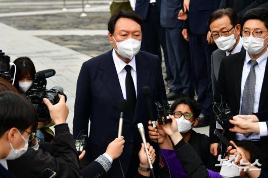 윤석열 국민의힘 대선후보가 11일 오후 경남 김해시 봉하마을을 찾아 고 노무현 전 대통령 묘역에 참배를 하고 취재진의 질문을 받고 있다.저작권자 © CBS 노컷뉴스 무단전재 및 재배포 금지