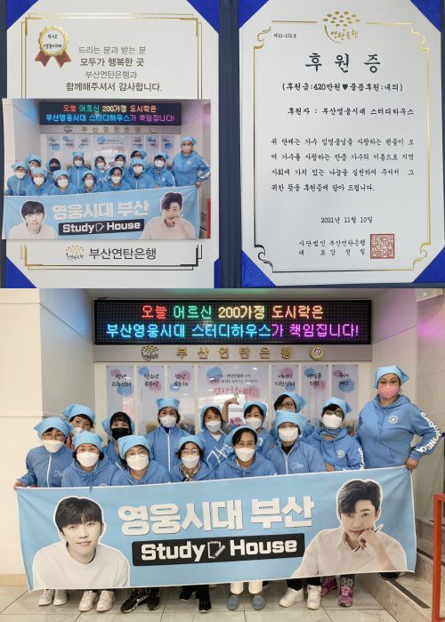 11일 부산 영웅시대 스터디하우스에 따르면 해당 단체는 부산연탄은행에서 하는 독거노인들을 위한 급식 나눔에 참여하고 있다. 매달 둘째 수요일에 50만원 후원과 도시락나눔 봉사를 진행 했고 지금까지 누적으로 현금 420만원과 물품을 기부해오고 있다.