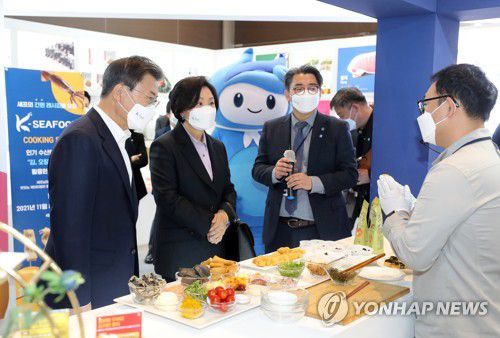 문 대통령은 문성혁 해양수산부 장관과 함께 K-시푸드 전시관도 둘러봤다.