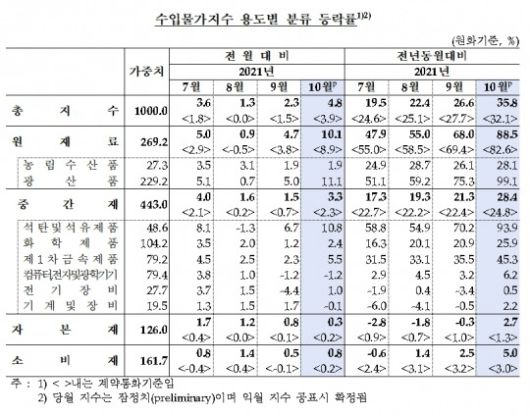 [한국금융신문 정선은 기자] 10월 수입물가가 국제유가 상승에 따라 반년째 상승세를 이어갔다. 특히 전년 동월 대비 상승폭이 36%에 달했다.