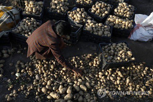 예멘의 한 농부가 수확한 감자를 고르는 모습 |