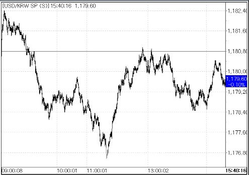 이날 환율은 전일대비 5.10원 오른 1186.00원에 시작해 1180원 후반대에서 등락하다 오후 들어 상승 폭을 줄였다. 장중 한 때 1182.40원까지 올랐으나 오전 중 하락 반전하더니 1170원 후반대에서 등락했다. 환율이 1170원대를 기록한 것은 지난 9일(1177.20원) 이후 사흘 만이다.