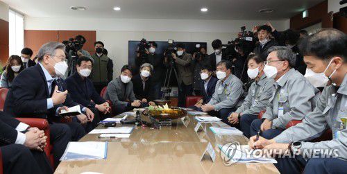 거제 대우조선소 경영진과 대화하는 이재명 대선후보 |