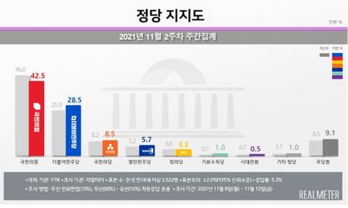 리얼미터가 YTN 의뢰로 지난 8∼12일 전국 18세 이상 2천522명을 조사한 결과 국민의힘 지지율은 42.5%로 나타났다. 리얼미터 조사에서 최고치를 경신한 지난주(46.0%)보다 3.5%포인트 하락한 수치다.