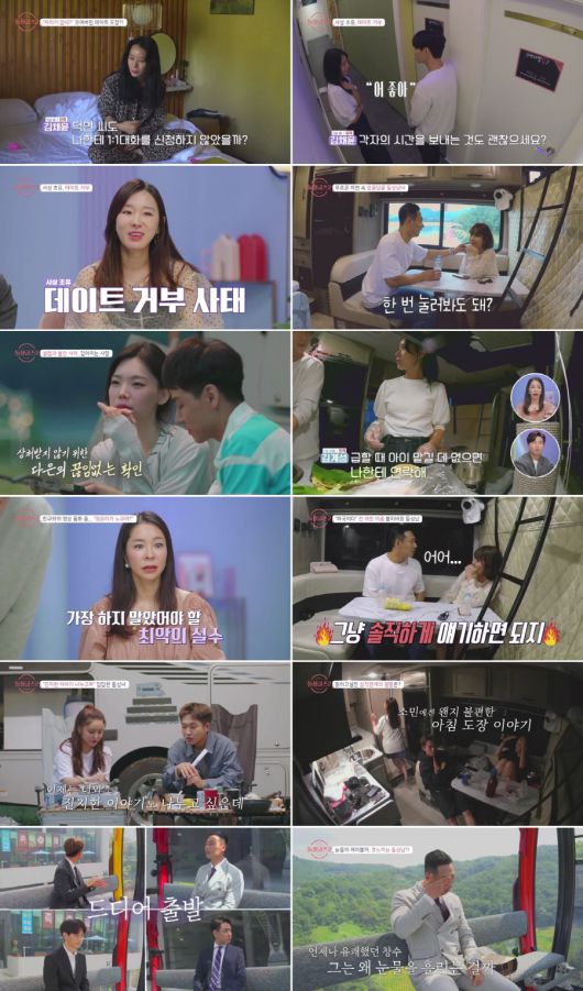 해가 뜨고, '돌싱 빌리지'에서의 마지막 데이트가 진행됐다. 가장 먼저 일어난 유소민은 "마지막에 남은 도장을 찍기 싫다"며 '캠핑카 데이트' 선택 판넬에 가장 먼저 도장을 찍었다. 이어 서로의 마음을 확인한 이창수X김은영, 윤남기X이다은이 짝을 이뤄 나란히 도장을 찍었다. 김계성은 고민하다가, 유소민이 찍지 않은 자리에 도장을 찍어, 자연스럽게 이덕연X유소민, 김계성X김채윤으로 짝이 정해졌다. 가장 늦게 도장을 찍게 된 김채윤은 이덕연이 아닌 김계성과의 데이트가 결정되자, 오랜 고민 끝에 김계성을 찾아가 "각자 시간을 보내는 건 어떠냐?"고 제안했다. 이 상황을 지켜본 4MC 이혜영, 유세윤, 이지혜, 정겨운은 "사상 초유의 데이트 거부 사태가 벌어졌다"고 '입틀막' 하면서도, "한편으로는 김채윤의 마음이 이해가 된다"며 안타까워했다.