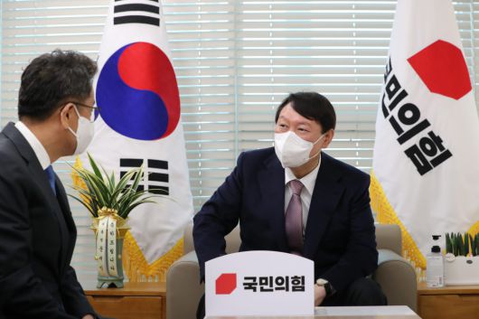 국민의힘 윤석열 대선 후보가 15일 오후 서울 영등포 국민의힘 당사에서 문재인 대통령의 축하 난 전달차 방문한 이철희 청와대 정무수석과 인사말을 나누고 있다. 국회사진기자단 |