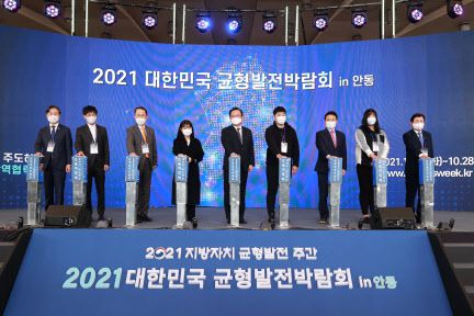 김부겸 국무총리(왼쪽 다섯 번째)가 26일 오후 경북 안동시 안동탈춤공연장에서 열린 2021 대한민국 균형발전 박람회 개막식에서 청년기업 대표자들과 버튼을 누르며 축하 퍼포먼스에 참여하고 있다.
