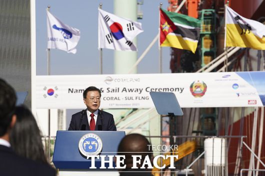이철희 청와대 정무수석은 16일 문재인 대통령의 임기 말 지지율이 역대 대통령에 비해 높게 나오는 것에 대해 "문재인 효과이지 않을까 싶다"라며 "바르고 착한 대통령이라고 생각한다. 제가 가까이 모셔서 그런지 모르겠지만 한 눈 안 팔고, 부패 안 하고, 권력의 단맛에 취하지 않고, 오직 일만 하시는 대통령이라 국민들이 그런 점을 높게 평가하지 않는가 싶다"고 말했다. 문 대통령이 전날 경남 거제시 삼성중공업 거제조선소에서 열린 한-모잠비크 부유식 해양 LNG 액화 플랜트(FLNG)선 출항 명명식에서 축사를 하는 모습. /청와대 제공 |