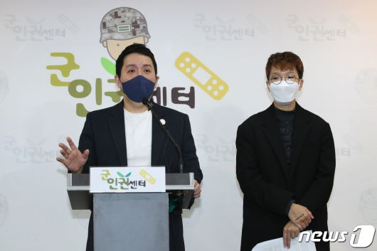 임태훈 군인권센터장이 15일 오전 서울 마포구 군인권센터에서 '공군, 성추행 피해 여군 사망 사건' 관련 기자회견을 하고 있다. 임 센터장은 기자회견에서 공군 8전투비행단에서 발생한 성추행 피해 여군 부사관 사망 사건을 공군이 스트레스 자살로 둔갑시키며 엉망진창으로 사건을 처리했다고 주장했다. 2021.11.15/뉴스1 © News1 이광호 기자 |