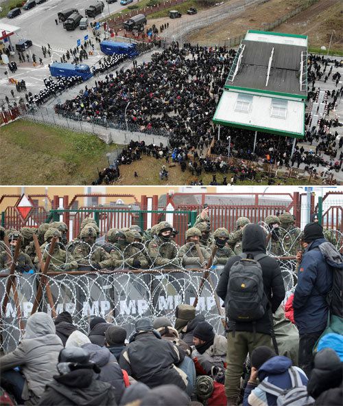‘폴란드 국경 개방’ 소문에 검문소 몰린 중동 난민들 15일 폴란드와 국경을 접한 벨라루스 서부 그로드노의 국경 검문소에 중동 난민들이 가득 모인 모습을 무인기로 공중 촬영한 사진. 이날 폴란드가 국경을 개방할 것이라는 소문이 퍼지면서 속속 몰려든 난민들이 검문소 일대를 가득 메우고 있다. 중무장한 폴란드 군인들이 국경검문소 앞에서 일렬로 서 있다. 맞은편 철조망 너머로 앉아서 폴란드 입국을 기다리는 난민들이 보인다(아래 사진). 그로드노=AP 뉴시스 |