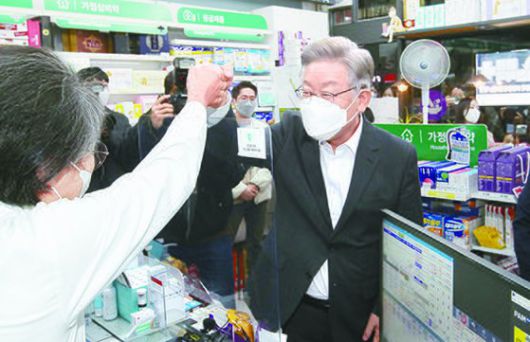 이재명 더불어민주당 대선후보(오른쪽)가 17일 서울 마포구 공공심야약국을 방문해 약사와 인사하고 있다. 이 후보는 공공의료체계의 필요성을 강조하며 “이것(심야약국)도 공공의료체계 일부로 급할 때 필요하다”고 말했다. [국회사진기자단] |