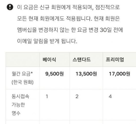 해당 요금은 신규 회원들을 대상으로 우선 적용된다. 이후 점진적으로 구독료 청구일을 맞은 기존 회원에게 적용되는 수순이다. 넷플릭스는 "현재 회원은 멤버십을 변경하지 않는 한 요금 변경 30일 전 이메일 알림을 받게 된다"고 전했다.