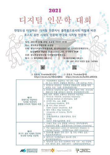 (서울=연합뉴스) 송광호 기자 = ▲ 2021 디지털 인문학 대회 = 한국학중앙연구원과 디지털인문학연구소는 한국디지털인문학협의회, 동국대학교 트랜스미디어세계문학연구소, 주식회사 PCN과 공동으로 오는 20일 한국학중앙연구원 소강당에서 '2021 디지털 인문학 대회'를 연다.