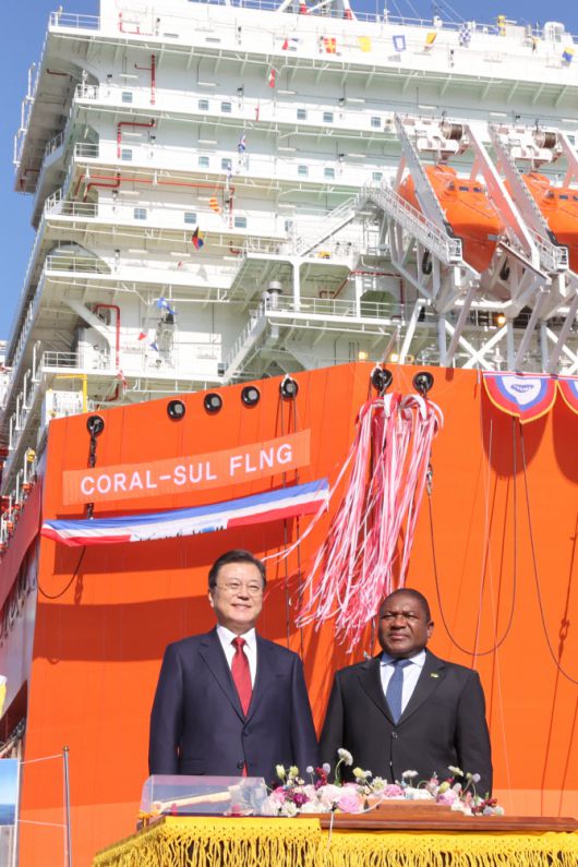 문재인 대통령과 필리프 뉴지 모잠비크 대통령이 15일 경남 거제시 삼성중공업 거제조선소에서 열린 한-모잠비크 부유식 해양 LNG 액화 플랜트(FLNG)선 출항 명명식에서 명명줄을 자른 뒤 코랄 술호를 배경으로 기념촬영하고 있다.(사진=연합뉴스) |