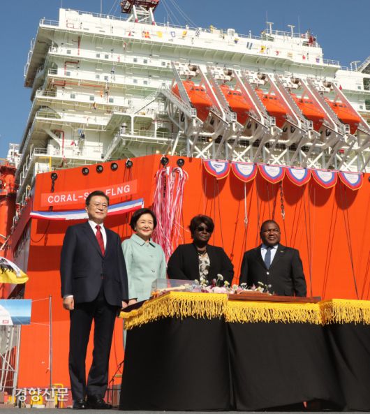 문재인 대통령이 지난 16일 참모회의에서 언론 보도에 대한 아쉬움을 담아 웃으며 했다는 말이다. 발언 하루 전 문 대통령은 김정숙 여사와 함께 국내 기술로 건조한 FLNG(Floating LNG·부유식 해양 LNG 액화플랜트) ‘코랄 술(Coral Sul) 호’ 출항 명명식 참석을 위해 경남 거제시 삼성중공업을 방문했다. 행사에는 ‘코랄 술 호’를 발주한 모잠비크의 필리프 자신투 뉴지 대통령 내외도 참석했다.