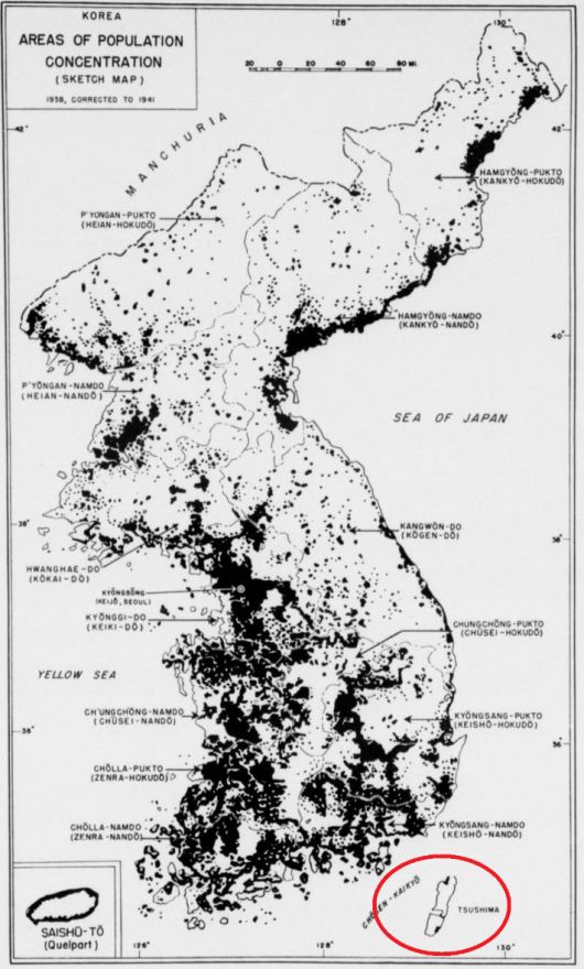 사진 1. 미국 JANIS 75권의 한국편 제1책 인구편에 등장하는 한국지도. 왼쪽 위편으로 '한국 인구밀집 지역'이라는 제목이 보이고, 왼쪽 아래에 제주도가 이어 오른편 아래쪽에 대마도(Tsushima)가 선명하게 인쇄돼 있다. 제주도 해안가로 인구가 밀집해 있는 것처럼 대마도 위 아래쪽으로 인구 밀집지역이 표시돼 있다. 출처 : 미국 국립문서보관청, NARA일본 정부가 김창룡 경찰청장의 독도방문의 틈을 타 해묵은 독도 영유권 분쟁화를 시도하고 있다.