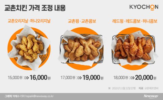 19일 관련업계에 따르면 교촌치킨을 운영하는 교촌에프앤비는 오는 22일부터 제품 권장 가격을 500원에서 최대 2000원까지 인상한다. 인상률은 평균 8.1%다.
