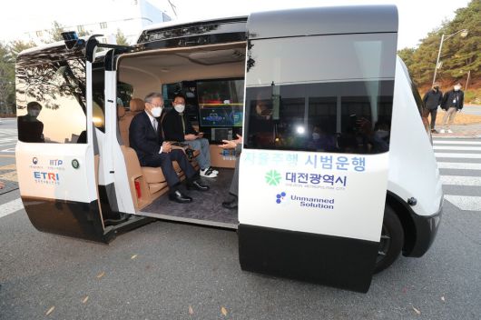 이재명 더불어민주당 대선 후보가 19일 오후 대전시 유성구 한국전자통신연구원(ETRI)을 방문해 오토비(자율주행차)에 올라 관계자들과 이야기를 나누고 있다. 대전/연합뉴스 |