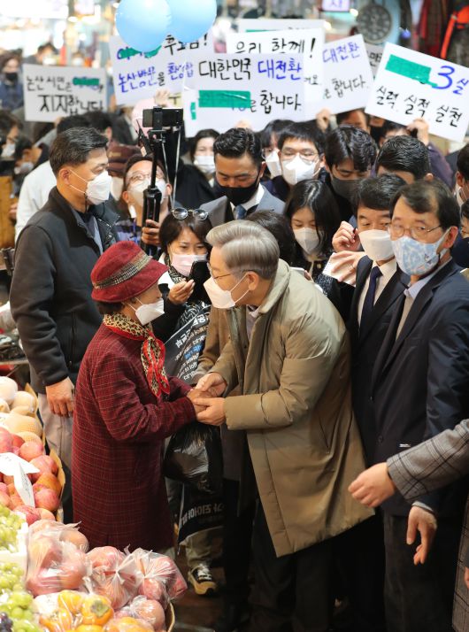 더불어민주당 이재명 대선후보가 20일 충남 논산시 화지중앙시장을 방문, 어르신과 인사하고 있다. /연합뉴스 |