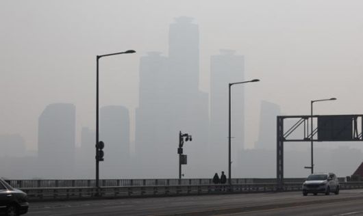 초미세먼지 주의보가 발령된 20일 서울 서강대교에서 바라본 도심이 뿌옇게 보이고 있다. 뉴스1 |