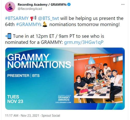23일 그래미 어워즈를 주관하는 미국 레코딩 아카데미는 공식 사회관계망서비스(SNS)를 통해 "BTS가 제64회 그래미 어워즈 후보를 발표하는 데 도움을 줄 예정"이라고 밝혔다.