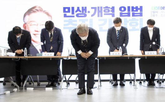 한편 이 후보는 이날 여당 지도부에 민생 현안 입법과 관련해 속도전을 요구했다. 그는 민생 개혁 입법 추진 간담회에서 “국민의 아픈 마음을, 어려움들을 더 예민하고 신속하게 책임지지 못한 점에 사과드린다”며 “깊이 성찰하고 반성하고, 앞으로는 지금까지와는 완전히 다른 변화되고 새로운 민주당이 되겠다”고 밝혔다. 이와 함께 “사죄의 절을 한 번 드리도록 하겠다”고 밝히며 카메라 앞에서 약 5초간 큰절을 했다.