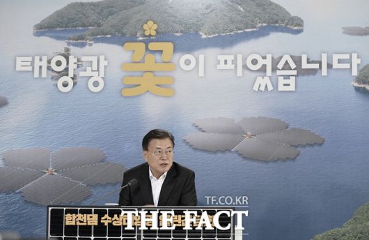 [더팩트ㅣ허주열 기자] 문재인 대통령은 24일 오후 경남 합천군 합천댐을 찾아 오늘부터 발전을 본격적으로 시작한 합천댐 수상태양광 현장을 시찰하고, 그간 공사에 참여한 지역주민과 현장 관계자를 격려했다.