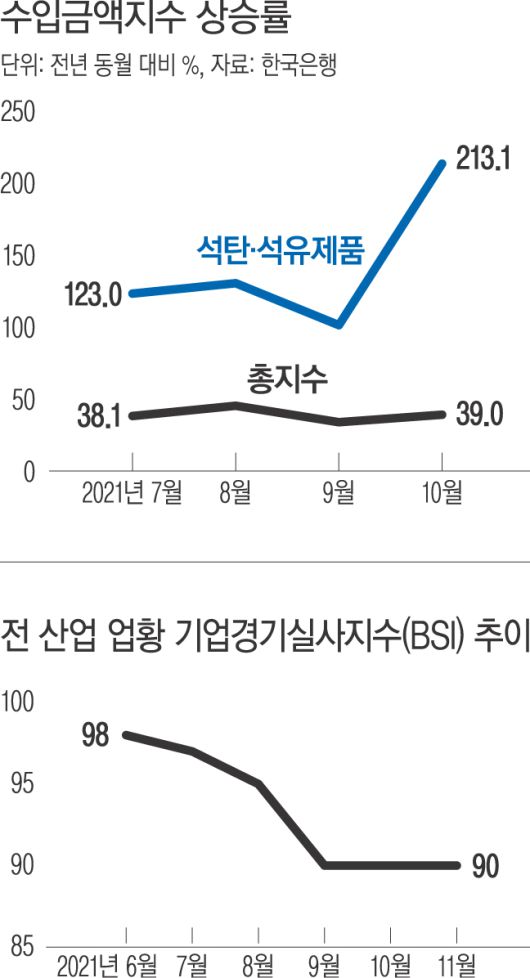 한국은행이 24일 발표한 ‘10월 무역지수 및 교역조건’ 통계를 보면 달러를 기준으로 한 지난달 수입금액지수(2015년 100 기준)는 150.27로 1년 전보다 39% 올랐다. 11개월 연속 상승했고, 오름폭도 9월 33.8%보다 커졌다. 수입금액지수 가운데 석탄·석유제품의 전년 동월 대비 상승률은 213.1%에 달했다. 1990년 11월(448.6%) 이후 31년 만에 최대 상승폭이다. 최진만 한은 경제통계국 물가통계팀장은 “최근 국제유가가 상승한 영향이 컸다”고 설명했다. 국제유가는 지난달 배럴당 80달러를 웃도는 높은 수준을 유지했다. 원자재 가격의 영향을 크게 받는 광산품(91.5%), 제1차 금속제품(69.5%) 등의 수입금액도 상승했다.