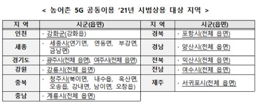 과기정통부는 이날부터 지난 4월 발표한 ‘농어촌 5G 공동이용 계획’에 따라 농어촌 5G 공동이용망 시범상용화도 시작했다. 농어촌 5G 공동이용은 농어촌에서도 5G 서비스를 이용할 수 있도록 통신3사가 망을 공동으로 이용하는 방안이다.