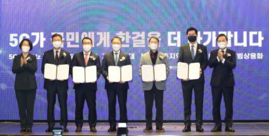 25일 오전 서울 여의도에서 열린 농어촌지역 5G 공동이용망 시범상용화 시연에서 지하철 와이파이 서비스 품질 향상을 위한 협약서를 든 참석자들이 기념촬영하고 있다. (왼쪽부터) 임혜숙 과기정통부 장관, 황현식 LG유플러스 대표, 유영상 SK텔레콤 대표, 구현모 KT대표, 김상범 서울교통공사 사장, 전경훈 삼성전자 사장, 국회 과방위 홍석준 의원. [이미지출처=연합뉴스] |