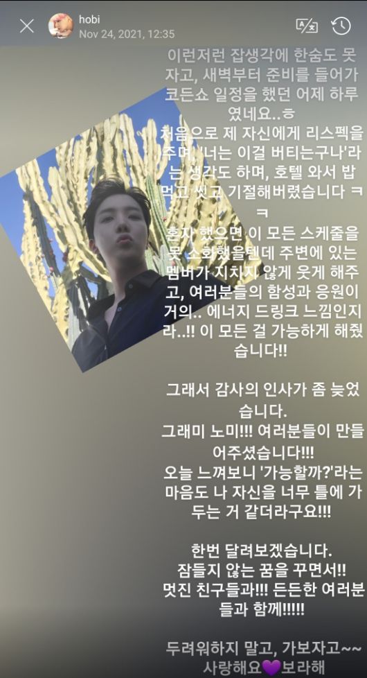 제이홉은 이에 대해 “감사의 인사가 좀 늦었습니다. 그래미 노미!! 여러분들이 만들어주셨습니다”라고 마음을 전했다.