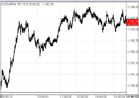 26일 서울외국환중개에 따르면 환율은 전 거래일 종가(1193.30원) 대비 3.10원 상승한 1193.30원에 마감했다. 지난달 13일(1193.80원)이후 가장 높은 수준이다. 이날 환율은 전일 대비 0.30원 가량 강보합 출발한 뒤 1190원대 초반대에서 움직였다.